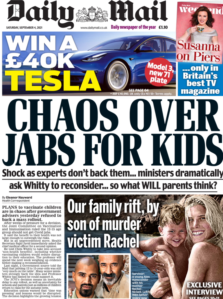 Η Daily Mail περιγράφει την απόφαση για τους εμβολιασμούς ως ένδειξη “χάους” και ρωτάει: “Τι θα σκέφτονται οι γονείς;” Η εφημερίδα αναφέρει ότι ο κ. Javid είπε στον καθηγητή Whitty να μην εξετάσει μόνο τα “οφέλη για την υγεία”, αλλά και την δυνατότητα μείωσης της αναταραχής στην εκπαίδευση των παιδιών. Η εφημερίδα σημειώνει ότι παραμένει η αβεβαιότητα για τα σχολεία και τους γονείς, καθώς εκατομμύρια παιδιά επιστρέφουν στην τάξη για την έναρξη της φθινοπωρινής περιόδου.