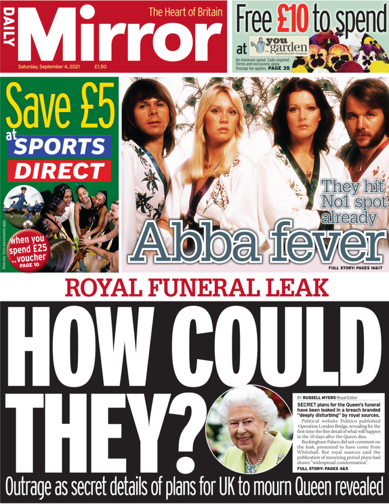 Εν τω μεταξύ, η Daily Mirror ρωτά «Πώς μπορούν;», καθώς επικρίνει το γεγονός ότι τα σχέδια για την κηδεία της βασίλισσας έχουν διαρρεύσει. Σύμφωνα με τη Mirror, η ανταλλαγή λεπτομερειών σχετικά με την επιχείρηση London Bridge χαρακτηρίστηκε ως «βαθιά ανησυχητική» από τις βασιλικές πηγές, ενώ το παλάτι του Μπάκιγχαμ δεν έχει σχολιάσει τη διαρροή.