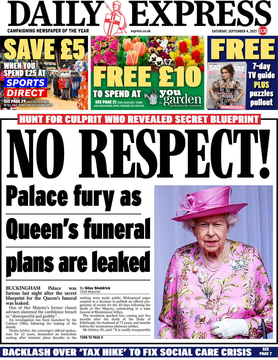 “Κανένας σεβασμός!” είναι ο τίτλος της Daily Express, η οποία σχολιάζει επίσης τη διαρροή σχετικά με τον εκ των προτέρων προγραμματισμό της κηδείας της βασίλισσας. Η Express επιλέγει να μην δημοσιεύσει πολλές από τις λεπτομέρειες που αποκαλύφθηκαν στη διαρροή από σεβασμό προς τη βασιλική οικογένεια. Ο αρθρογράφος Leo McKinstry χαρακτηρίζει την αποκάλυψη “νέο πύραυλο αναλγησίας” μετά τη δύσκολη χρονιά που αντιμετώπισε η μονάρχης, σημειώνοντας ότι εγείρει νέα ερωτήματα σχετικά με τον αριθμό των διαρροών που προέρχονται από τα υψηλότερα επίπεδα διακυβέρνησης.