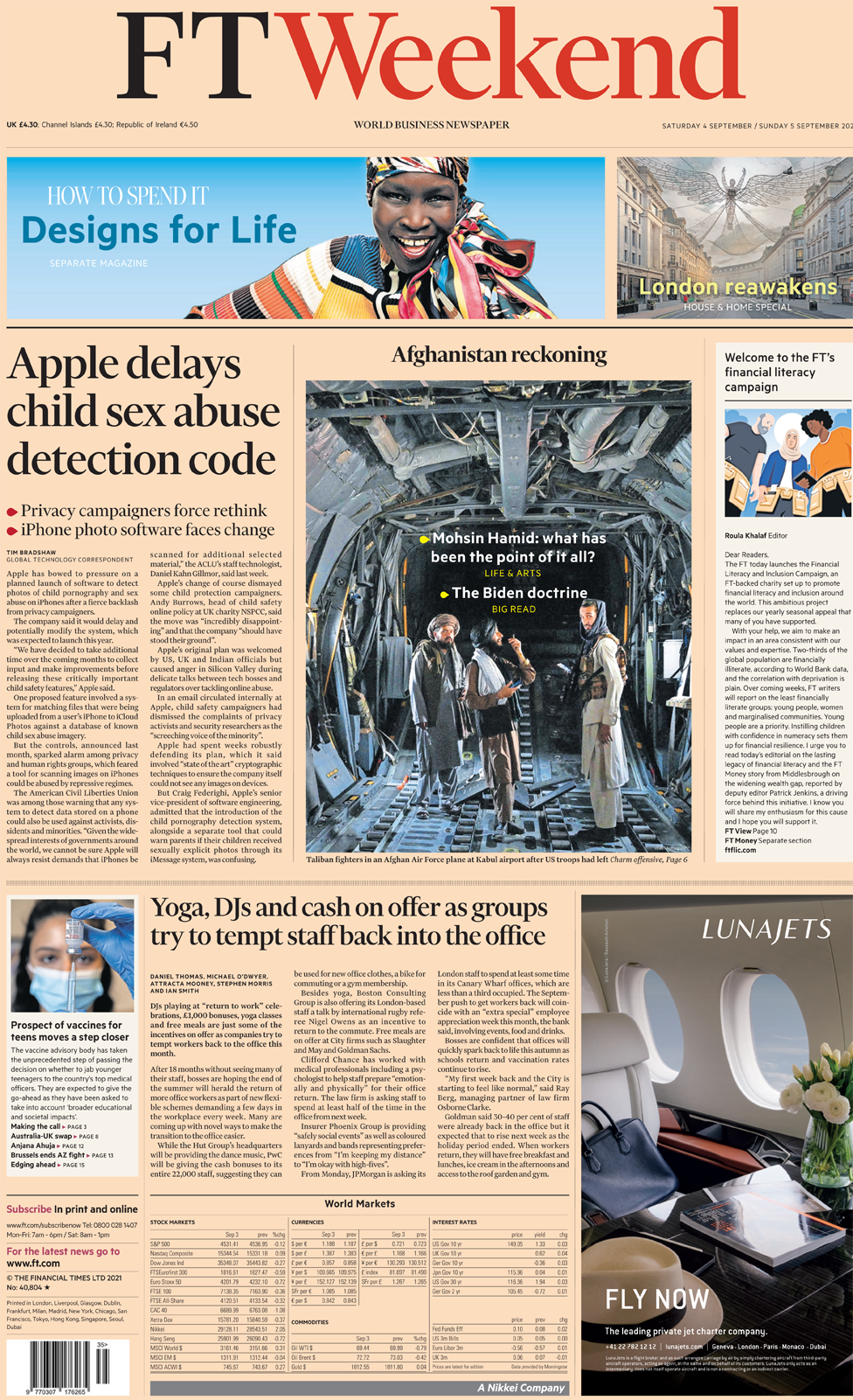 Εν τω μεταξύ, οι Financial Times του Σαββατοκύριακου αναφέρουν την απόφαση της Apple να καθυστερήσει την κυκλοφορία λογισμικού που θα ανιχνεύει φωτογραφίες παιδικής πορνογραφίας και σεξουαλικής κακοποίησης σε iPhone, μετά από αντιδράσεις των ομάδων προστασίας της ιδιωτικής ζωής και των ανθρωπίνων δικαιωμάτων. Οι ακτιβιστές φοβούνται ότι το εργαλείο θα μπορούσε να χρησιμοποιηθεί από αυταρχικά καθεστώτα. Σε άλλο άρθρο της, η εφημερίδα επισημαίνει μερικά από τα πιο ασυνήθιστα κίνητρα που προσφέρουν οι μεγάλες εταιρείες στους εργαζόμενους για να επιστρέψουν στο γραφείο. Αναφέρει ότι η Hut Group προσλαμβάνει DJs για να προσφέρει μια αισιόδοξη μουσική υπόκρουση για τους εργαζόμενους, ενώ άλλες εταιρείες προσφέρουν μαθήματα γιόγκα, δωρεάν γεύματα και μπόνους σε μετρητά.