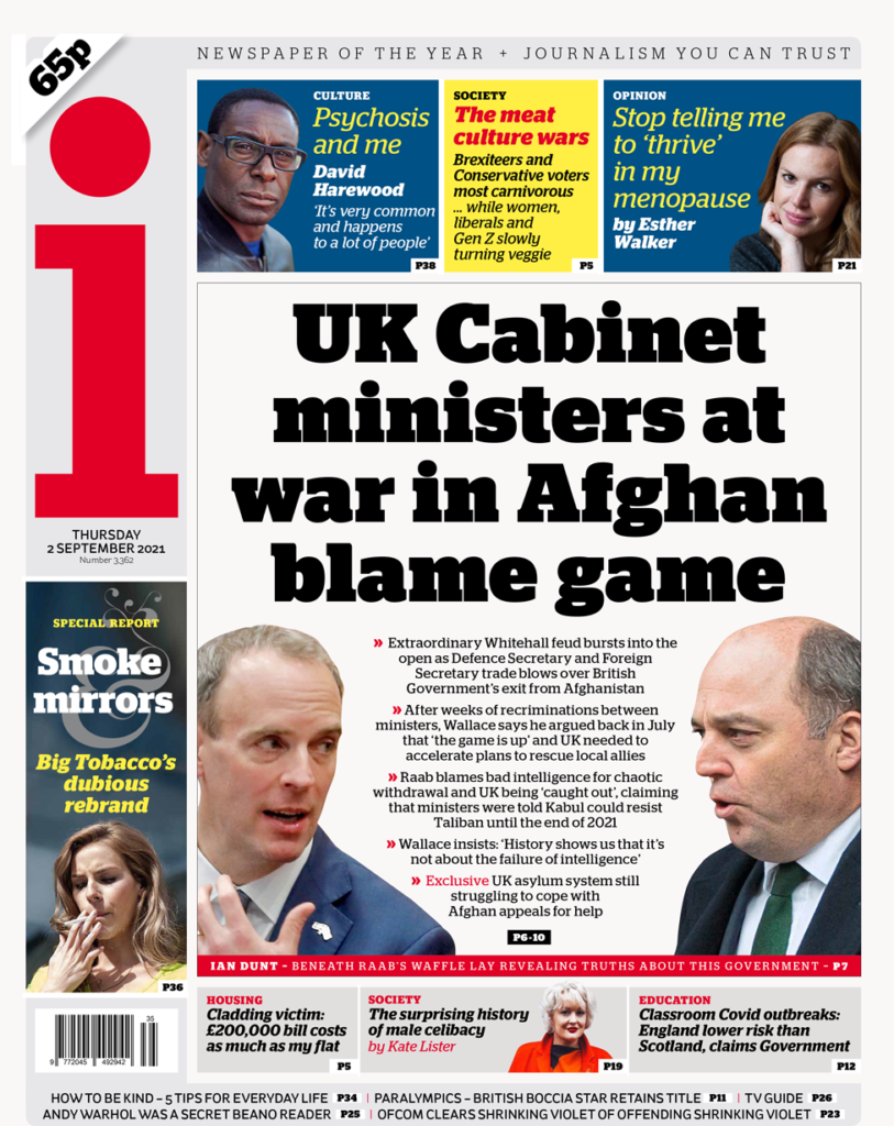 Η εφημερίδα i γράφει ότι ο υπουργός Εξωτερικών και ο υπουργός Άμυνας «βρίσκονται σε πόλεμο» σε ένα «παιχνίδι ευθυνών» για την έξοδο του Ηνωμένου Βασιλείου από το Αφγανιστάν. Αναφέρεται στα σχόλια του Ben Wallace, ο οποίος ισχυρίζεται ότι υποστήριζε από τον Ιούλιο ότι “το παιχνίδι έχει τελειώσει” και ότι το Ηνωμένο Βασίλειο έπρεπε να επιταχύνει για τη διάσωση των τοπικών συμμάχων, ωστόσο ο κ. Raab, ρίχνει το φταίξιμο για τη χαοτική απόσυρση στην κακή πληροφόρηση, που επέμενε ότι η Καμπούλ θα αντέξει μέχρι το τέλος του 2021.