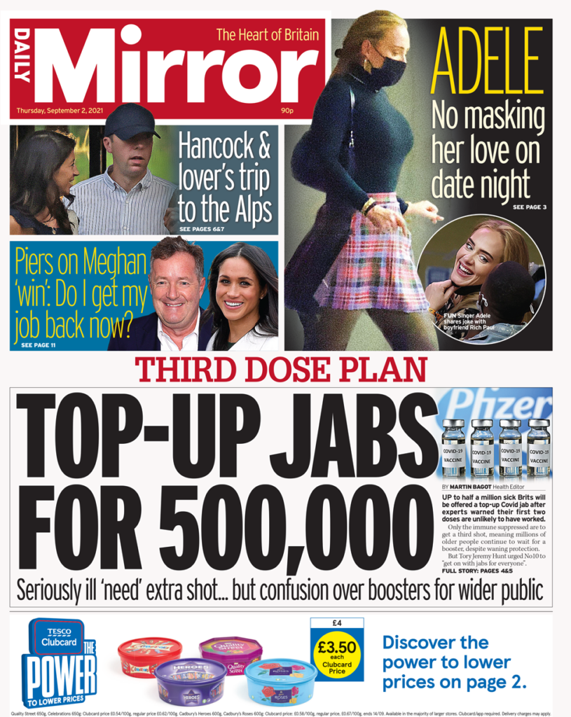 Η απόφαση να χορηγηθεί μια τρίτη δόση του εμβολίου κατά του κορωνοϊού σε άτομα με σοβαρά εξασθενημένο ανοσοποιητικό σύστημα βρίσκεται σε πολλά από τα πρωτοσέλιδα, με αρκετές εφημερίδες να δημοσιεύουν την ανακοίνωση εκτιμώντας σε μισό εκατομμύριο τους ανθρώπους που είναι πιο ευάλωτοι. Η Mirror σημειώνει ότι αυτό γίνεται αφού οι ειδικοί προειδοποίησαν ότι δύο δόσεις είναι απίθανο να έχουν λειτουργήσει για τους πιο σοβαρά ανοσοκατασταλμένους. Εντούτοις επισημαίνει ότι υπάρχει «σύγχυση» σχετικά με το αν ο ευρύτερος πληθυσμός θα κάνει τη συμπληρωματική δόση αργότερα.
