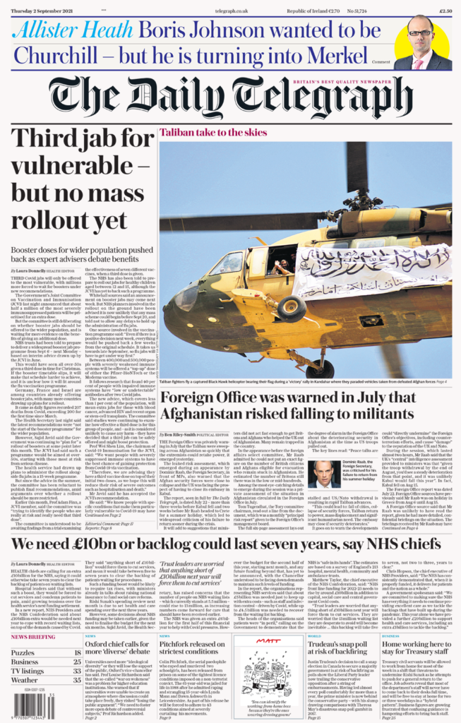 Μια ευρύτερη εκστρατεία ενίσχυσης για το εμβόλιο επρόκειτο να ξεκινήσει τη Δευτέρα, αλλά τώρα είναι πιθανό να καθυστερήσει, σύμφωνα με τους Times. Ωστόσο, κυβερνητικές πηγές λένε στην εφημερίδα ότι η Μικτή Επιτροπή Εμβολιασμού και Ανοσοποίησης θα συστήσει ένα ενισχυτικό πρόγραμμα «πολύ σύντομα». Η εφημερίδα εστιάζει στους ισχυρισμούς ότι μια προειδοποίηση για την ταχεία πτώση του Αφγανιστάν συμπεριλήφθηκε σε έκθεση που δόθηκε στον υπουργό Εξωτερικών τον Ιούλιο. Ο πολιτικός συντάκτης των Times, Oliver Wright, καταλήγει στο συμπέρασμα ότι ο κ. Raab έφυγε από την ακρόαση της Επιτροπής Εξωτερικών Υποθέσεων των Κοινοτήτων, «πολιτικά μελανιασμένος, αλλά χωρίς να έχει υποστεί δολοφονικά χτυπήματα».