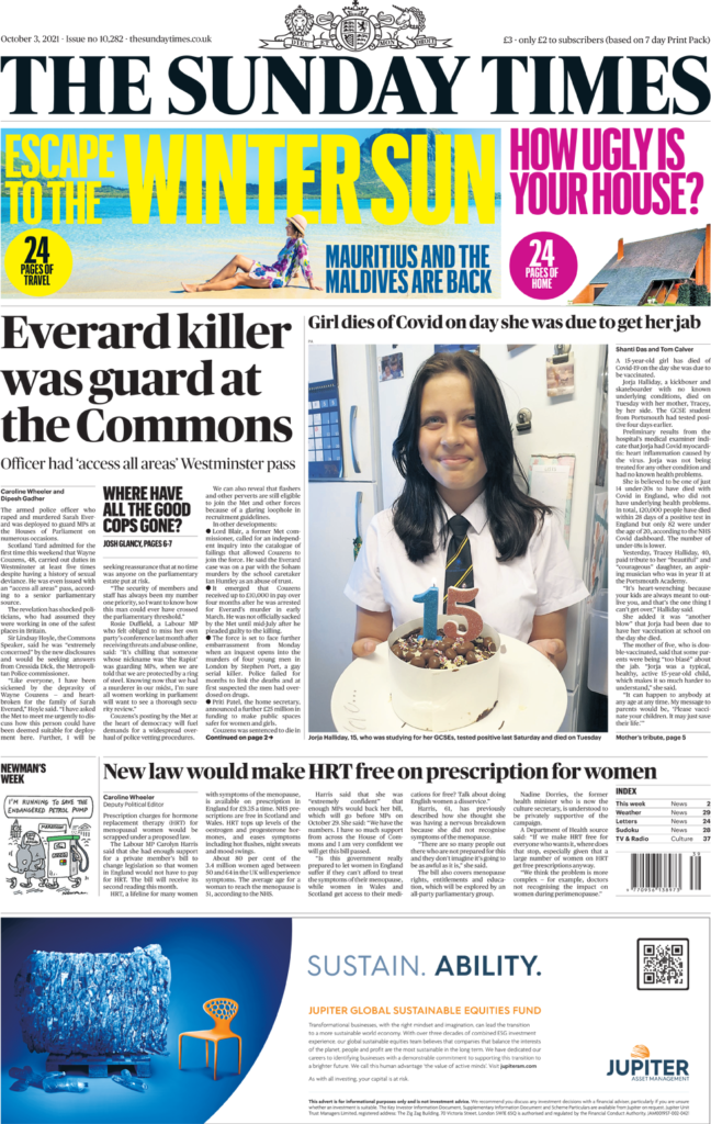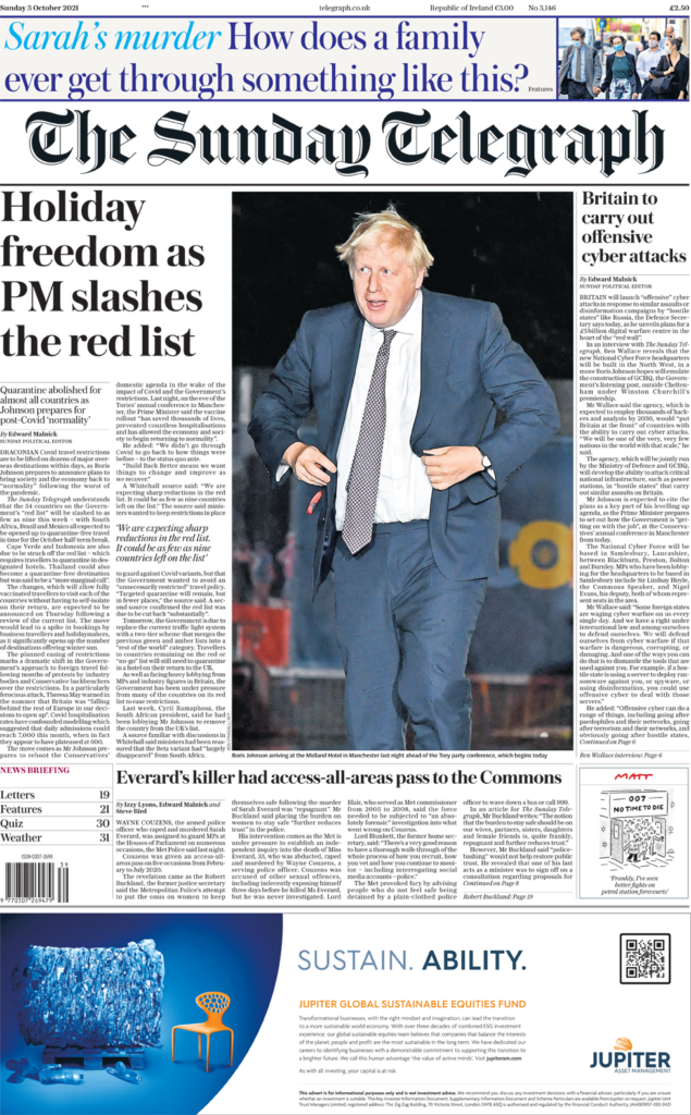 Ο Observer αναφέρει ότι οι διαδικασίες ελέγχου της αστυνομίας θα αναθεωρηθούν μετά την καταδίκη του Couzens, ενώ ο πρώην επίτροπος της Μητροπολιτικής Αστυνομίας, Ian Blair πιέζει για έρευνα για τη δολοφονία και για το πώς ο Couzens έγινε αστυνομικός. Η εφημερίδα ζητά έρευνα για τον μισογυνισμό εντός της Μητροπολιτικής Αστυνομίας και καταδικάζει την αστυνομική δύναμη που εξέδωσε μια “εντελώς ακατάλληλη” οδηγία μετά τη δίκη του Couzens. Η οδηγία σύστηνε στις γυναίκες που υποψιάζονται για τα κίνητρα αστυνομικού, να καλέσουν το 999 για να ελέγξουν την ταυτότητά του. Ο Observer υποστηρίζει ότι “όλη η έμφαση δίνεται στο να αλλάξουν οι γυναίκες συμπεριφορά για να προστατευθούν, ενώ υπάρχει έλλειψη στρατηγικής για την πρόληψη της ανδρικής βίας”. Εν τω μεταξύ, ο Μπόρις Τζόνσον έχει προειδοποιηθεί από ομάδα Συντηρητικών βουλευτών ότι δεν μπορεί να κάνει τα φτωχότερα μέρη του Ηνωμένου Βασιλείου πιο ευημερούμενα και να “ανεβάσει” τη χώρα, ενώ ταυτόχρονα αυξάνει τους φόρους για τους εργαζόμενους και μειώνει τις παροχές. Η προειδοποίηση συνέπεσε με την άφιξη του πρωθυπουργού στο Manchester για τη διάσκεψη του κόμματος του. Στους βουλευτές που εκφράζουν αυτές τις ανησυχίες περιλαμβάνονται κι εκείνοι που κέρδισαν έδρες από τον «κόκκινο τοίχο» των Εργατικών στις γενικές εκλογές του 2019.