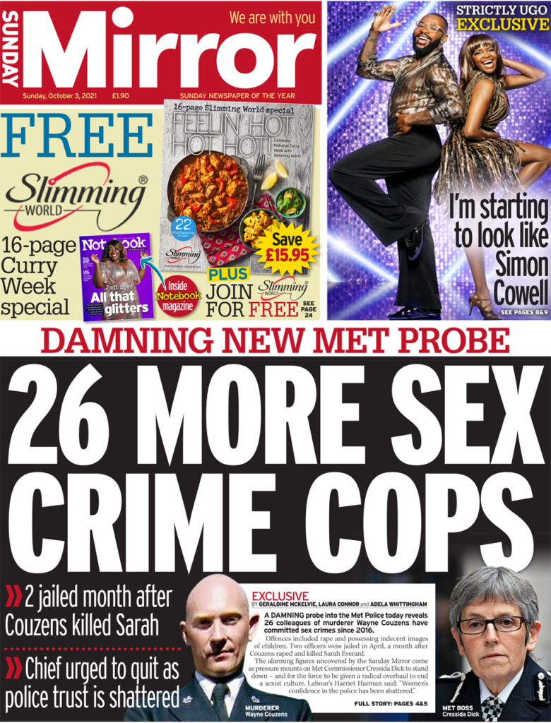 Σύμφωνα με την Mirror της Κυριακής, περίπου 26 αστυνομικοί της Μητροπολιτικής Αστυνομίας, έχουν διαπράξει σεξουαλικά εγκλήματα από το 2016. Ο βιασμός και η κατοχή απρεπών φωτογραφιών παιδιών συγκαταλέγονται στα αδικήματα, σύμφωνα με την εφημερίδα, με δύο αστυνομικούς να φυλακίζονται τον Απρίλιο, έναν μήνα μετά την δολοφονία της Sarah Everard από τον Couzens. Εν τω μεταξύ, η Dame Cressida αντιμετωπίζει πιέσεις για παραίτηση με την εφημερίδα να επικαλείται τη βουλευτή των Εργατικών Harriet Harman, η οποία δήλωσε: «Η εμπιστοσύνη των γυναικών στην αστυνομία έχει κλονιστεί». Τέλος, η εφημερίδα αναφέρει ότι η βασίλισσα, η οποία εμφανίστηκε μαζί με τον Daniel Craig κατά την τελετή έναρξης των Ολυμπιακών Αγώνων του Λονδίνου το 2012 στην πραγματικότητα βρίσκει τις αποστολές του ως 007 πολύ θορυβώδεις. Η αποκάλυψη προέρχεται από τον βασιλικό βιογράφο Gyles Brandreth, ο οποίος δηλώνει ότι η βασίλισσα, “πραγματικά αγάπησε όλες τις πρώτες ταινίες του James Bond, πριν γίνουν τόσο θορυβώδεις”.