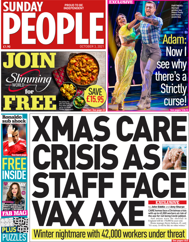 «Χειμερινός εφιάλτης» είναι ο τίτλος των Sunday People, οι οποίοι σημειώνουν ότι οι οίκοι ευγηρίας αντιμετωπίζουν χριστουγεννιάτικη «κρίση» με περισσότερα από 42.000 άτομα να κινδυνεύουν να χάσουν τη δουλειά τους επειδή δεν έχουν εμβολιαστεί κατά του κορωνοϊού. Τα συνδικάτα έχουν προειδοποιήσει ότι η έλλειψη προσωπικού στην Αγγλία θα φτάσει τις 170.000 μέχρι το τέλος του έτους, προσθέτει η εφημερίδα. Ο διευθυντής οίκου ευγηρίας, Kerry Jackson, δήλωσε: «Είναι τρομακτικό. Θα είναι ένας χειμώνας χωρίς προηγούμενο».